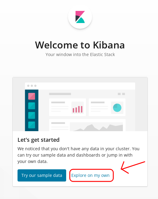 You want to choose Explore on my own.  The sample data can be useful to see what sort of cool things you can do within Kibana but you can add it later if you like.  You want to get to using the thing right?