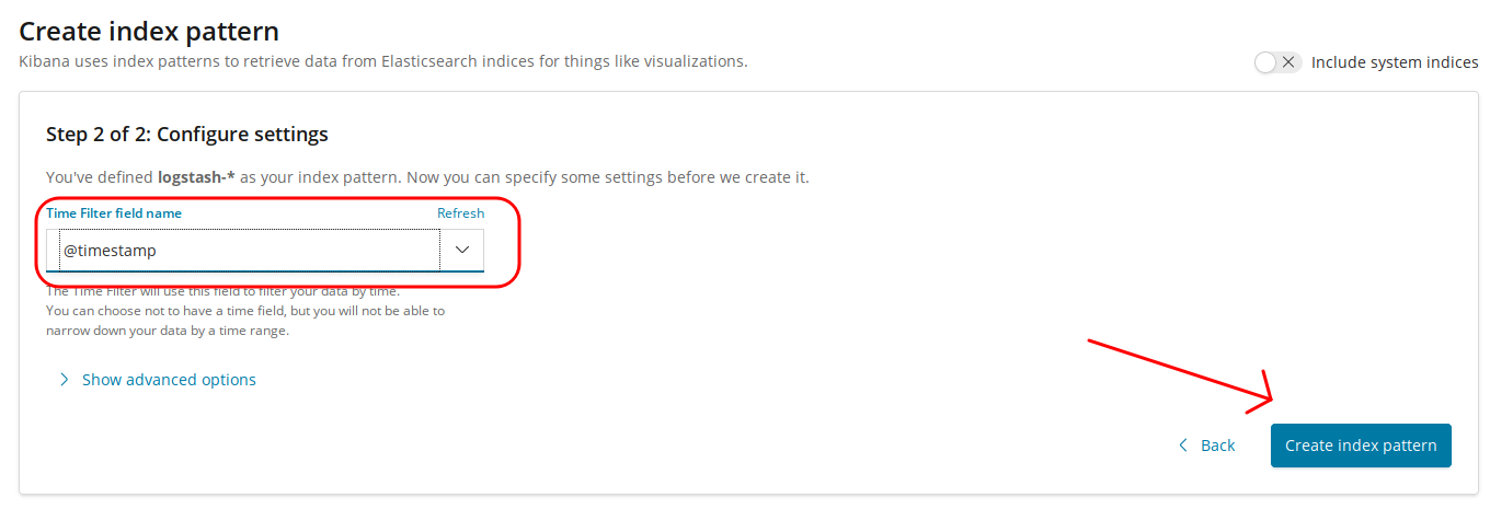 Next, choose @timestamp from the drop-down.  Click Create index pattern.
