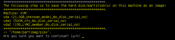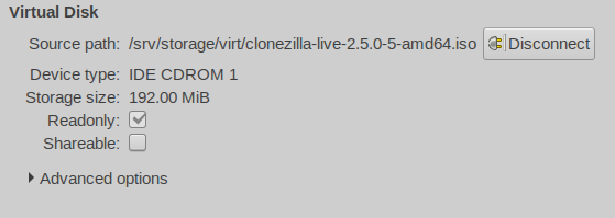 While you’re at it, copy the Clonezilla image over to your Hypervisor storage domain so it’s accessible from KVM as you’ll be booting your VM to it to backup the disk image.
