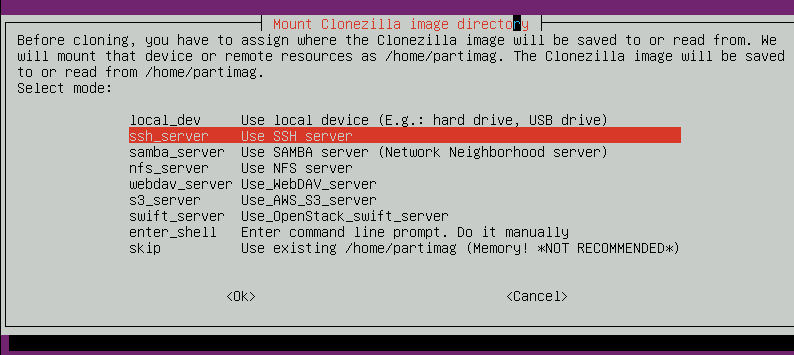 - Clonezilla supports NFS, CIFS and other options if you don’t want to use SSHFS.