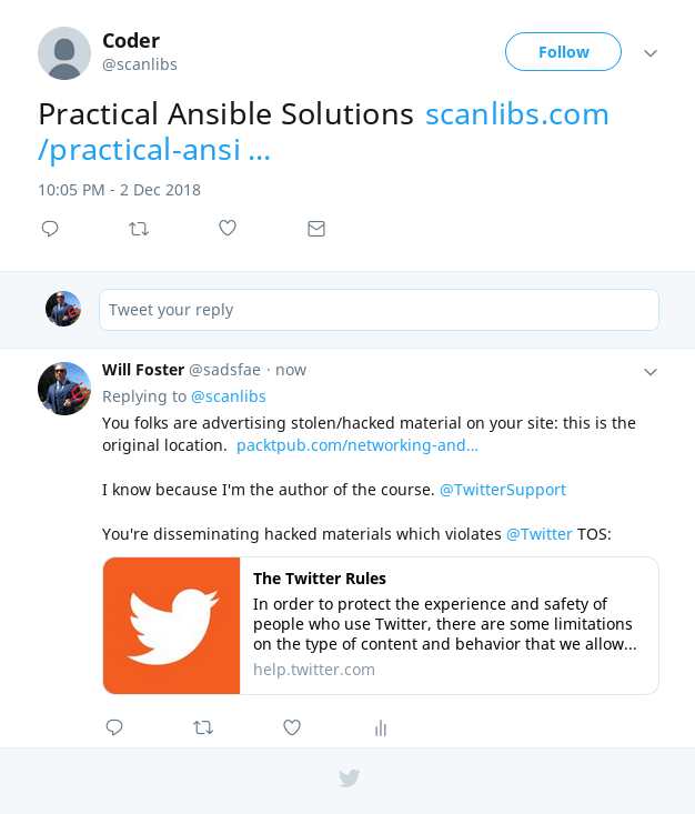 I’ve reported them already via Twitters counterfeit reporting forms but as of typing this their account is still online. I’ve also followed up with Packt Publishing legal team so we’ll see what happens.