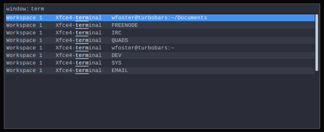 Heavier DE’s like KDE or GNOME have had this functionality for some time but I don’t want to run those (and associated libraries and dependencies) for a few small quality-of-life improvements at the cost of completely re-arranging my rather simple, stays-out-of-my-way love affair with XFCE and usual workflow. I just want to be able to search my open windows dammit!